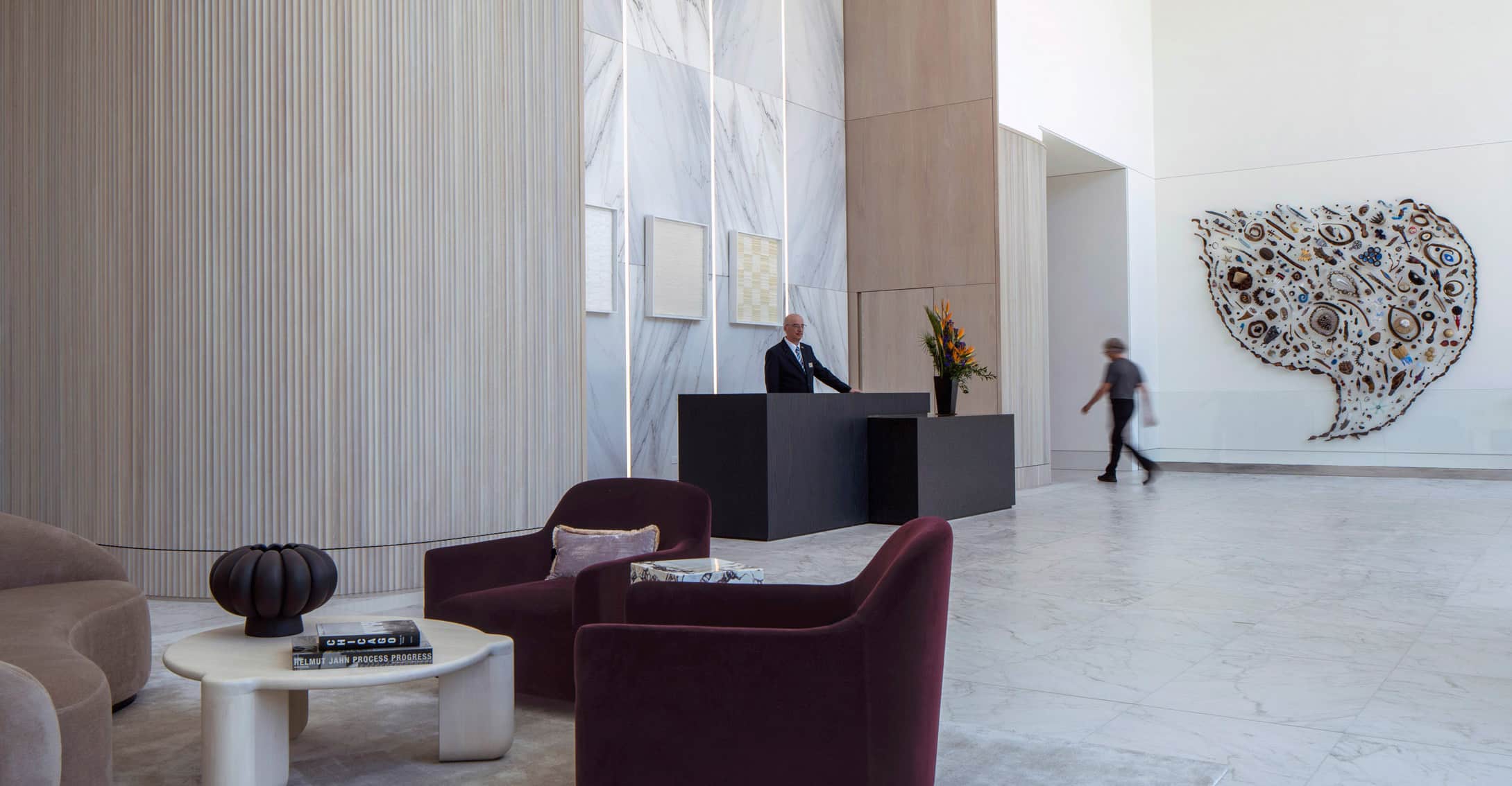 - Curated rotating art and design installations throughout