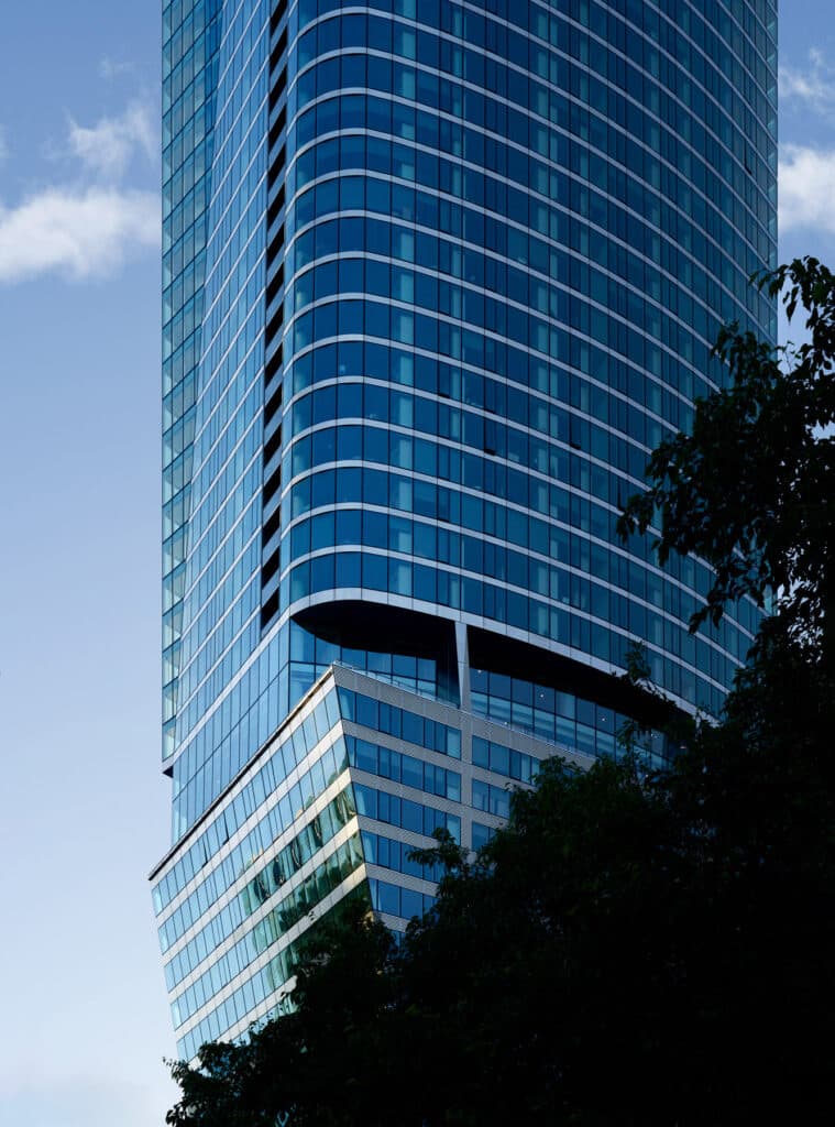 Jahn/ sought inspiration from the site’s position at the intersection of nature and city. The east and west facades converge at sharp edges on the northeastern and southwestern corners, while the opposing corners resolve into soft curves.
